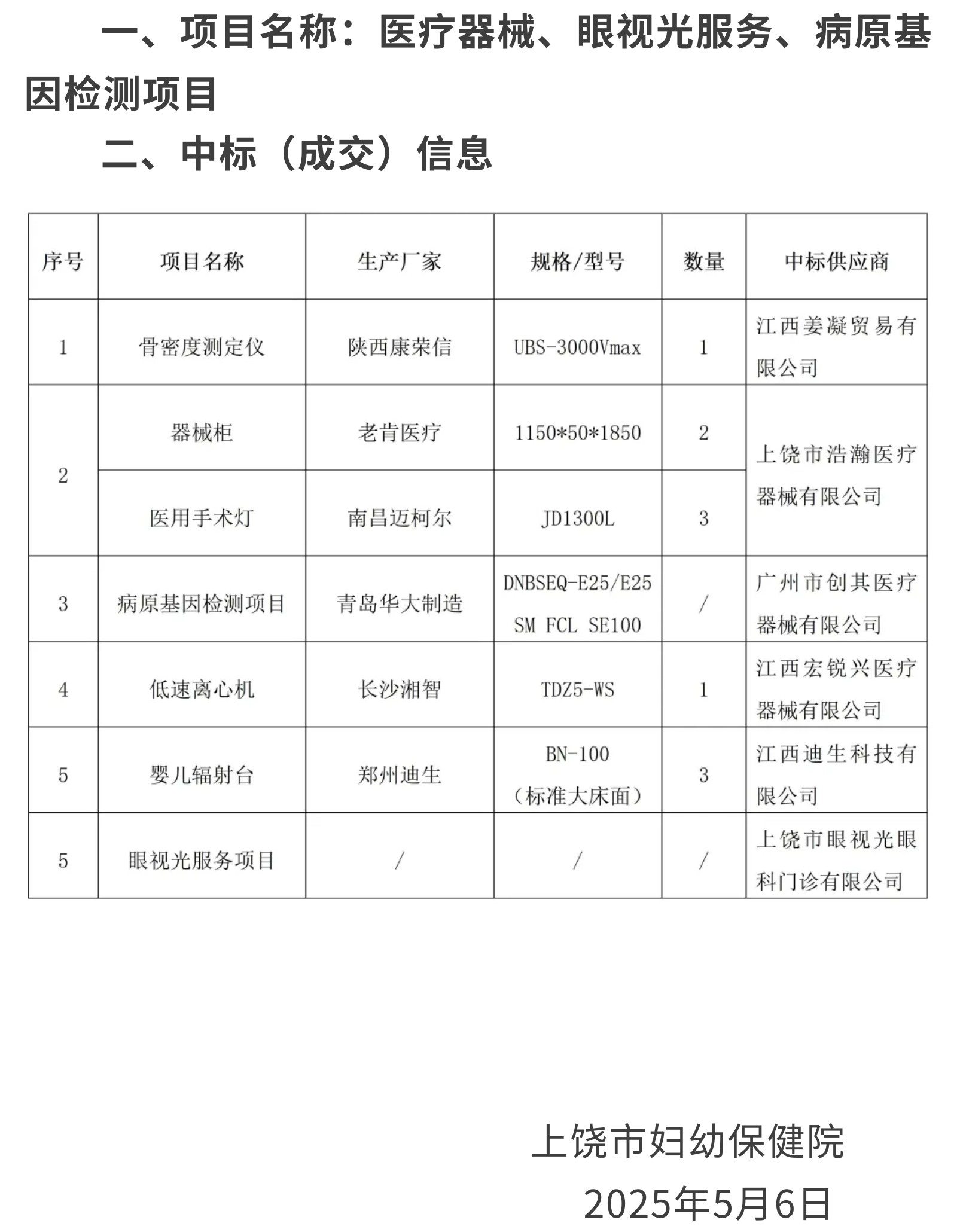 上饶市妇幼保健院医疗器械、眼视光服务、病原基因检测采购项目结果公示