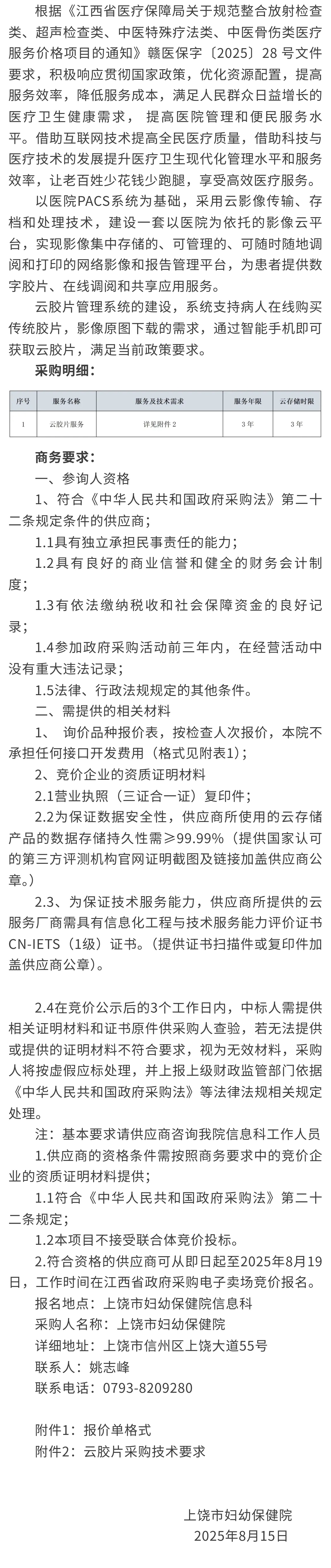 上饶市妇幼保健院云胶片服务采购项目竞价公示