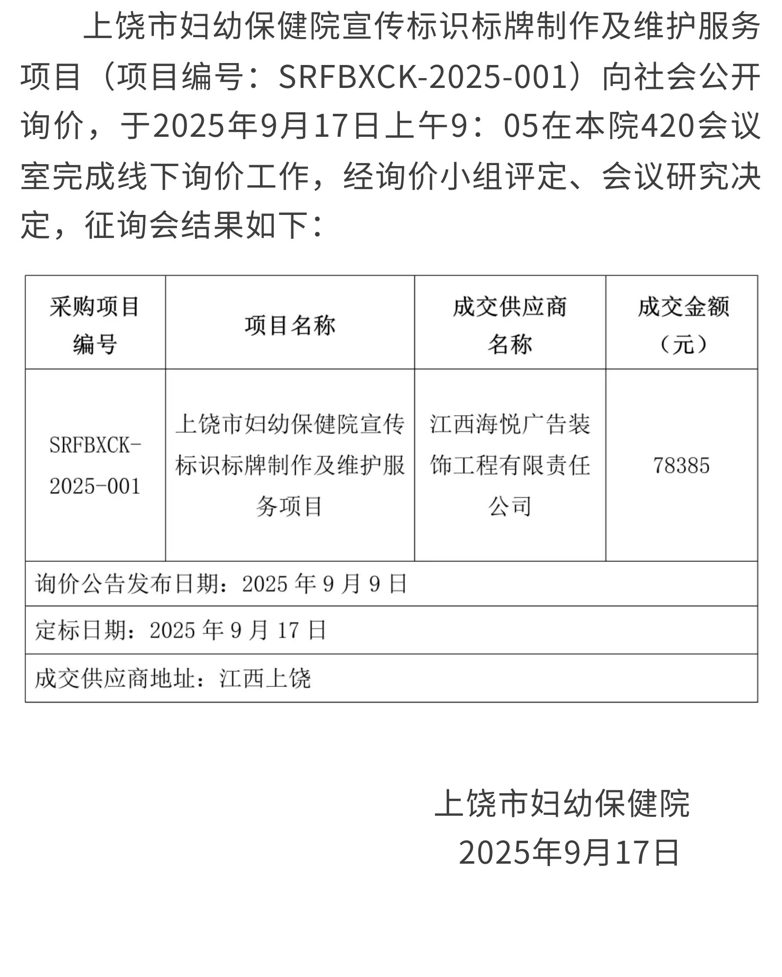 上饶市妇幼保健院宣传标识标牌制作维护服务项目询价采购成交公告