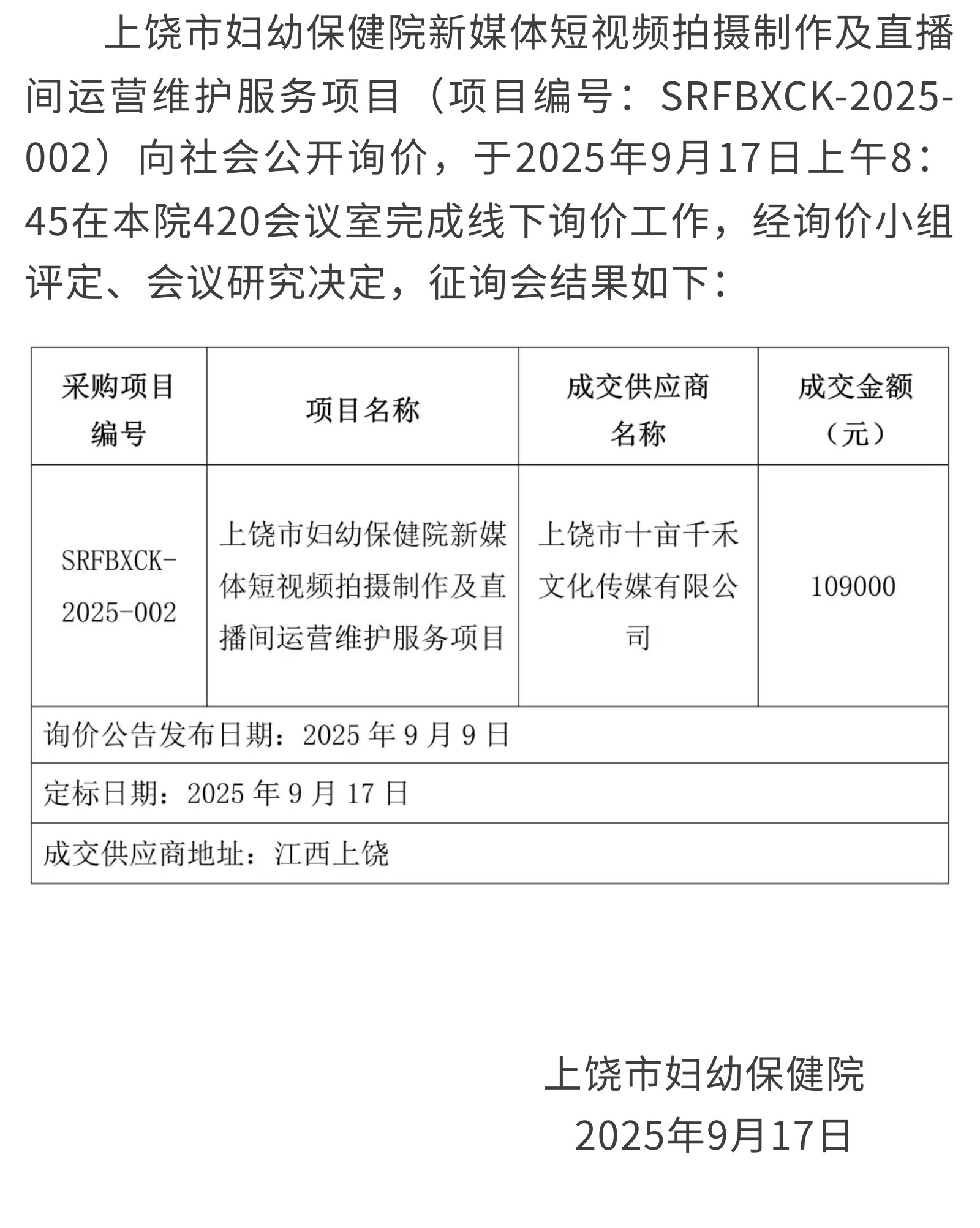 上饶市妇幼保健院新媒体短视频拍摄制作及直播间运营维护服务项目询价采购成交公告