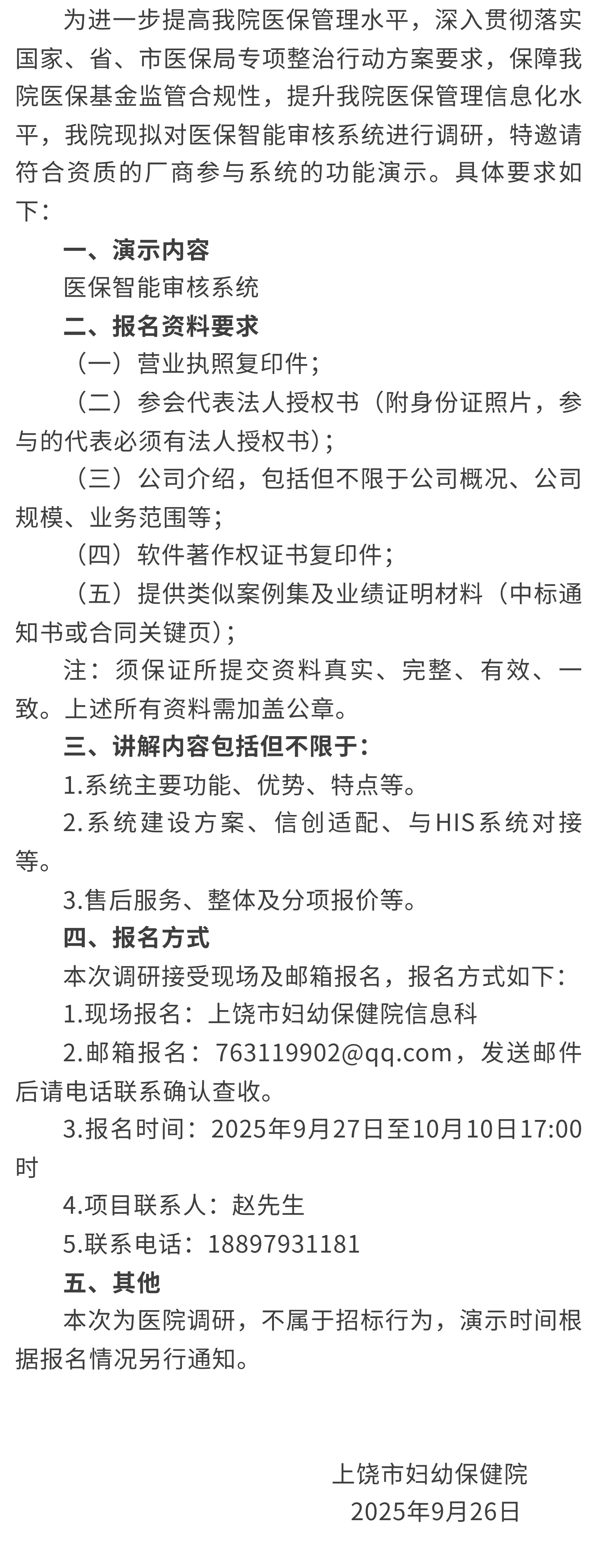 上饶市妇幼保健院关于医保智能审核系统咨询公告
