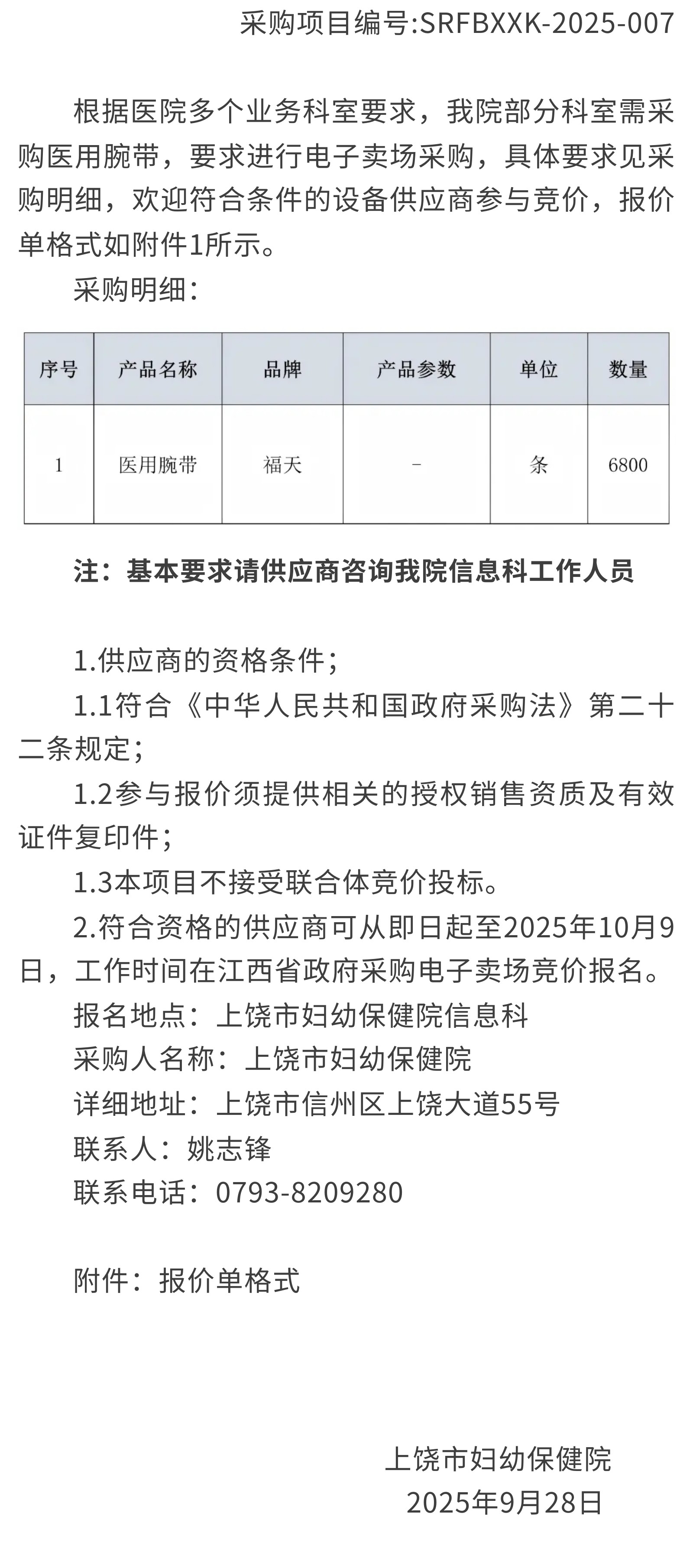 上饶市妇幼保健院腕带采购竞价公示