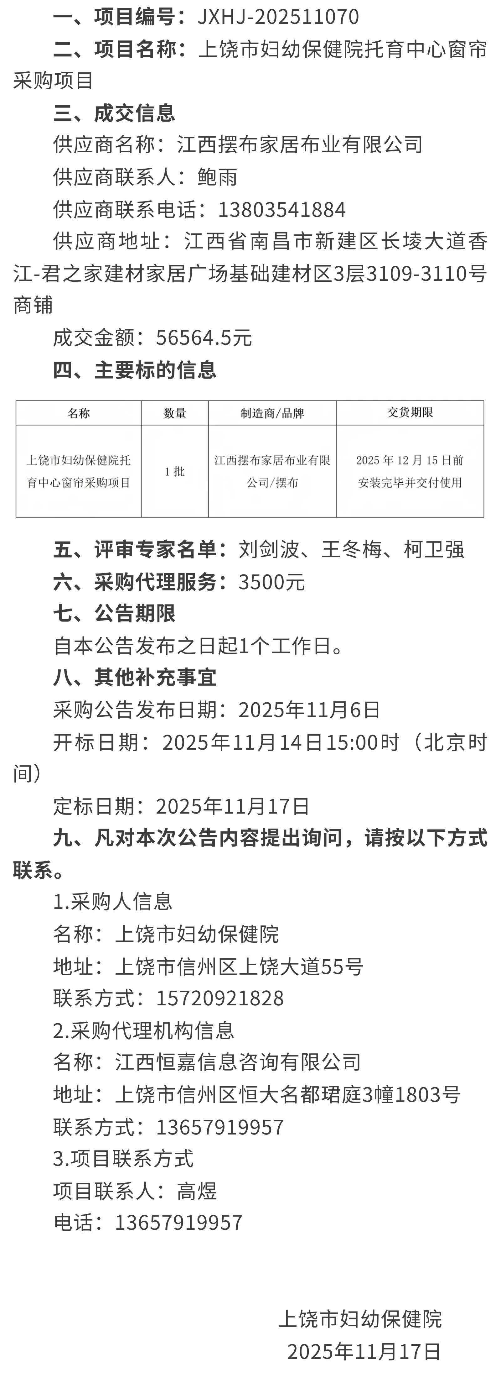 江西恒嘉信息咨询有限公司关于上饶市妇幼保健院托育中心窗帘采购项目(项目编号:JXHJ-202511070)询价成交结果公告