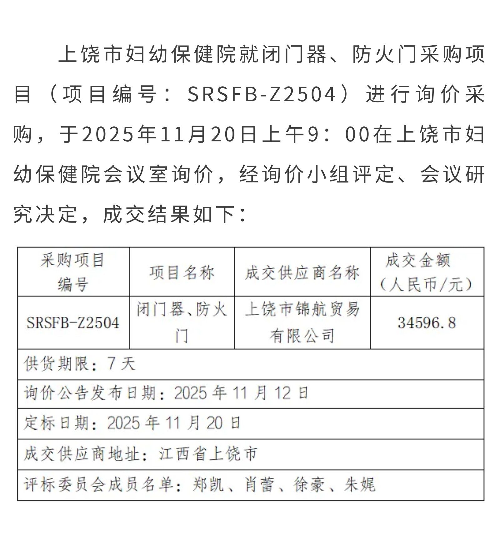 上饶市妇幼保健院闭门器、防火门采购项目(项目编号:SRSFB-Z2504)询价采购成交公告