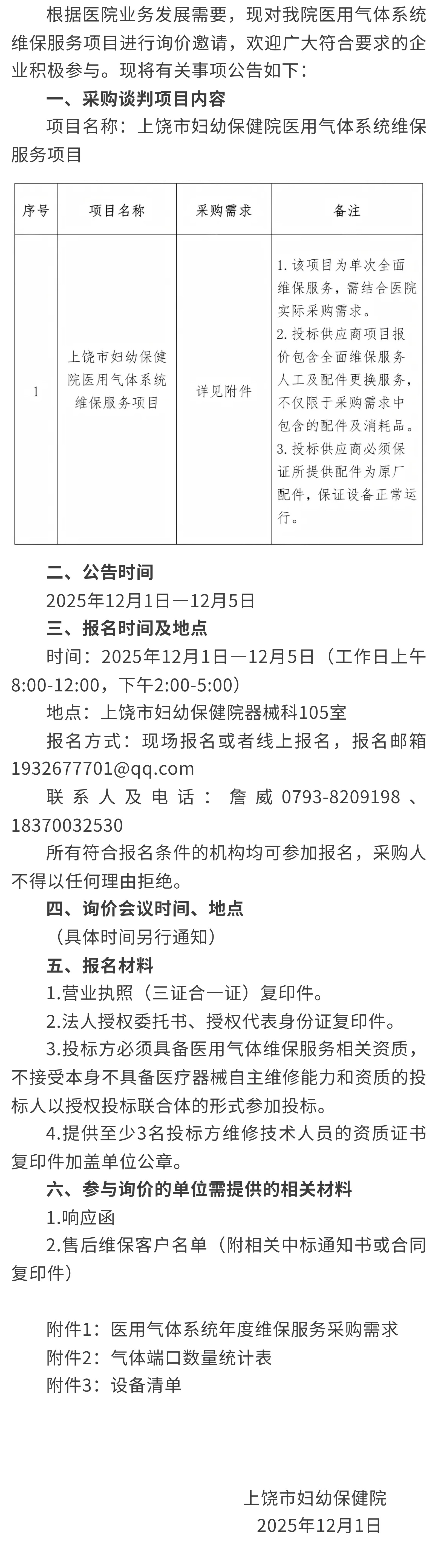 上饶市妇幼保健院医用气体系统维保服务采购公告
