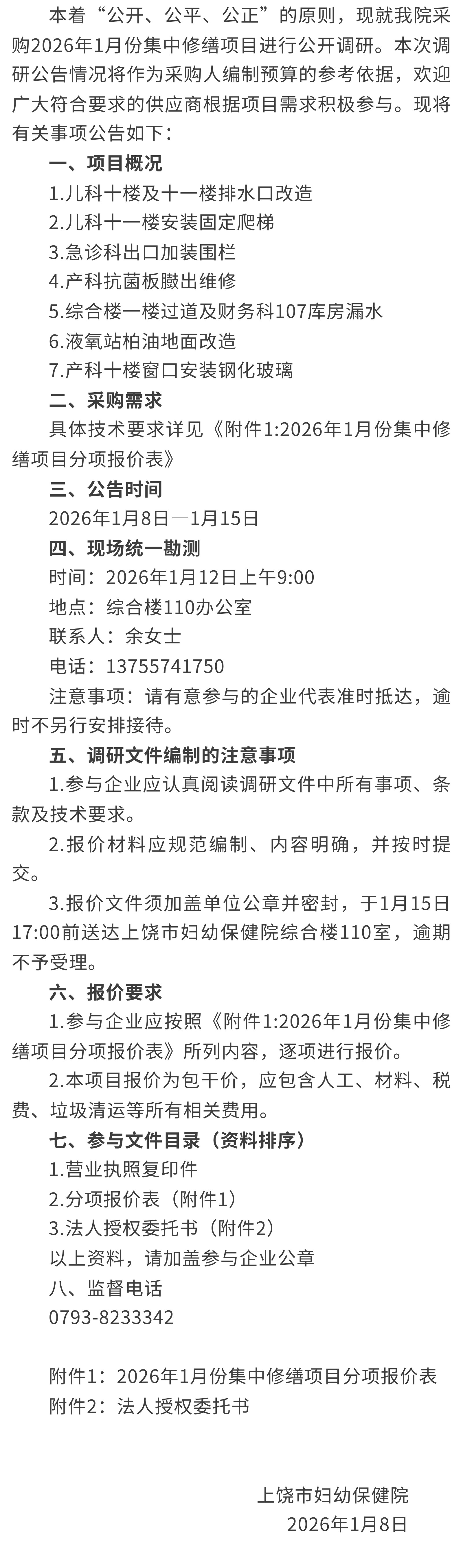 上饶市妇幼保健院采购2026年1月份集中修缮项目调研公告