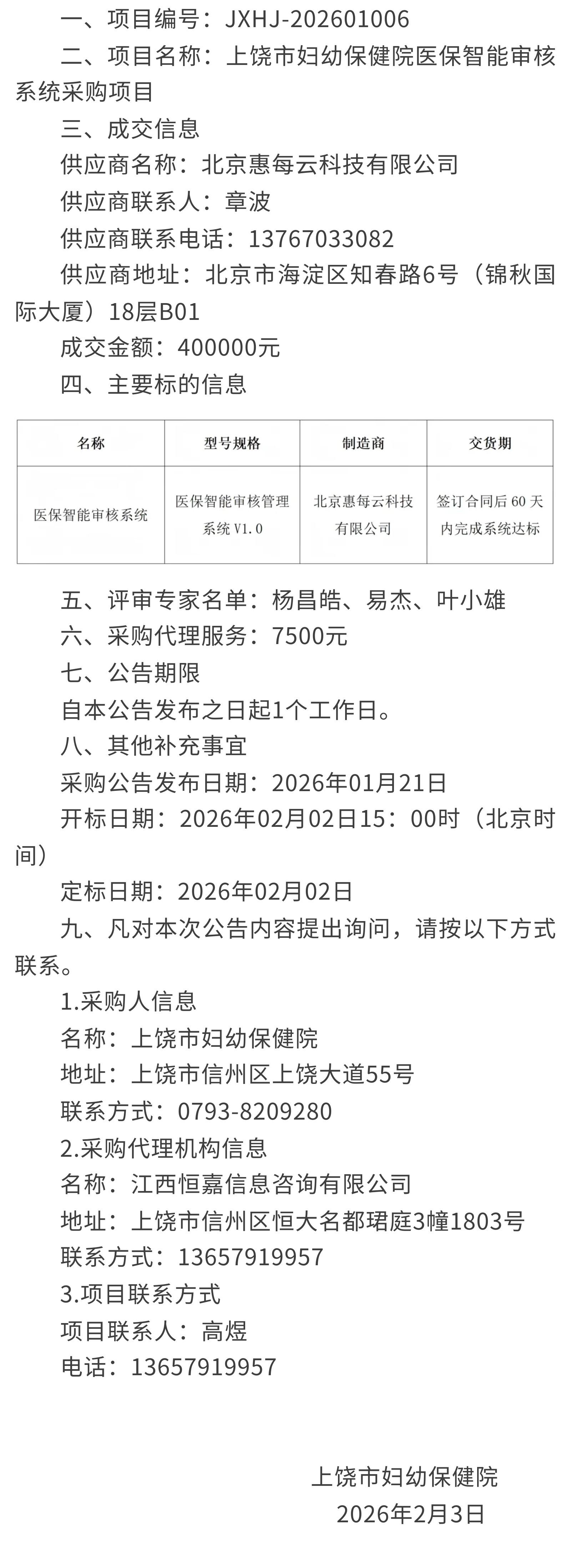 江西恒嘉信息咨询有限公司关于上饶市妇幼保健院医保智能审核系统采购项目(项目编号:JXHJ-202601006)竞争性磋商成交结果公告