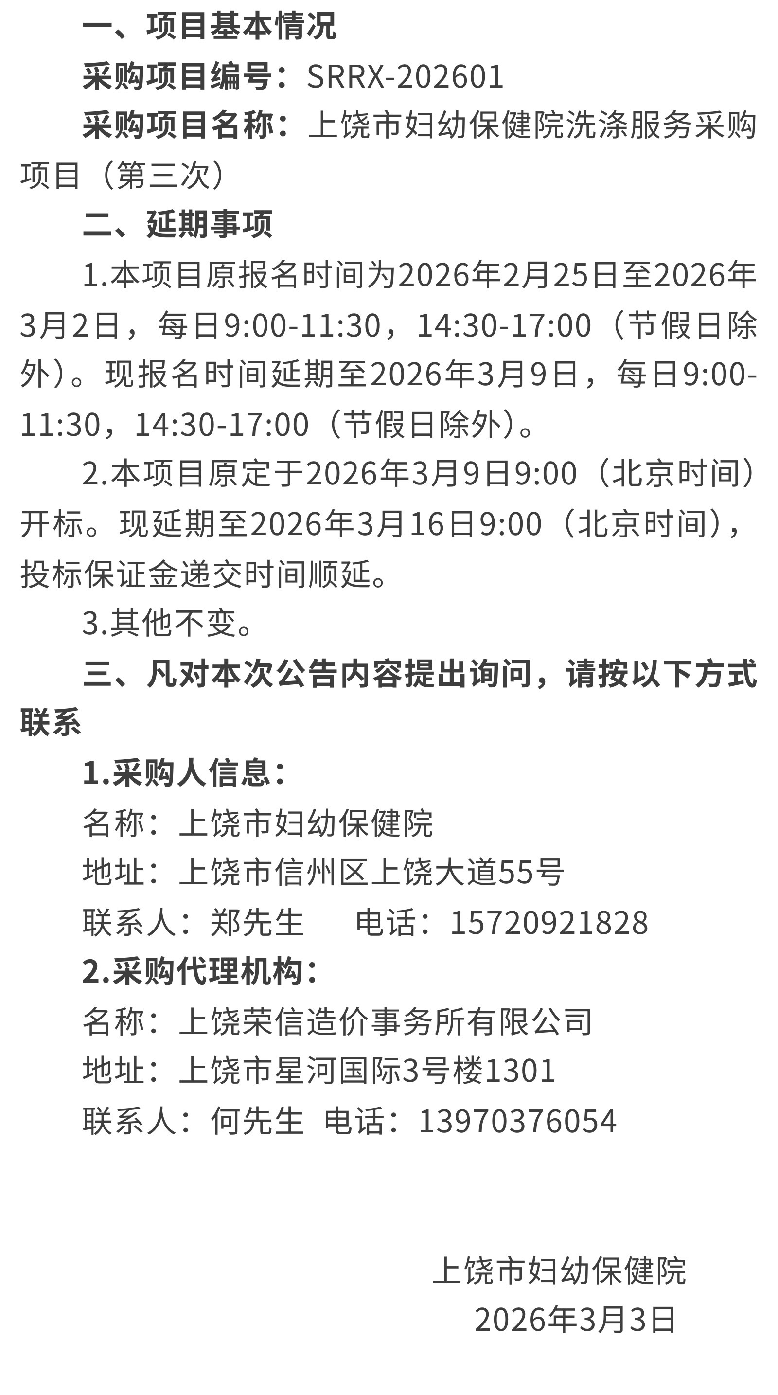 上饶市妇幼保健院洗涤服务采购项目(第三次)延期公告