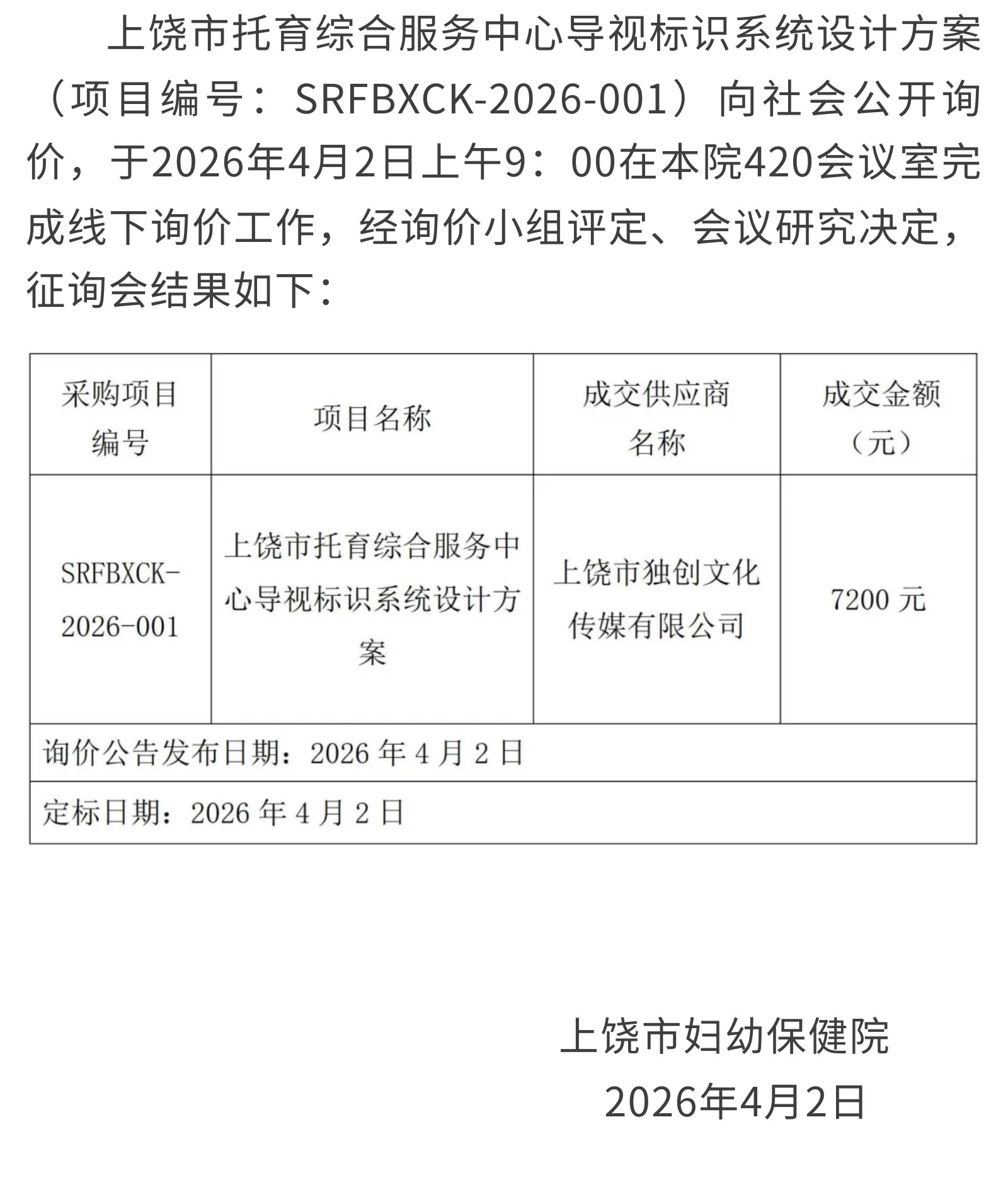 上饶市托育综合服务中心导视标识系统设计方案 (项目编号:SRFBXCK-2026-001)询价采购成交公告